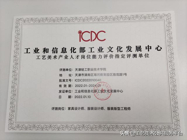工艺美术产业“人才岗位能力评价证书”评测中心落地天津轻工职业技术学院,工美从业者可通过天津轻工职业技术学院参加《工艺美术产业“人才岗位能力评价证书”评测》,评测内容主要包含家具设计师、服装设计师、服装版型工程师。评测合格后,可获得工业和信息化部工业文化发展中心与人才交流中心颁发的《工艺美术产业“人才岗位能力评价证书”》。