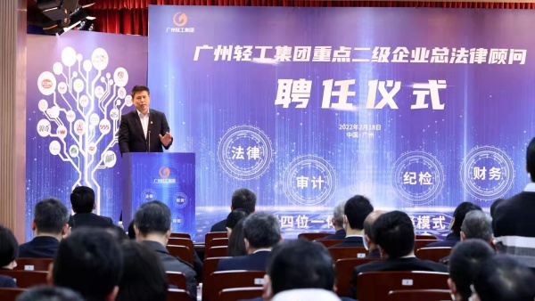 2月18日,市属国企广州轻工集团举办重点二级企业总法律顾问聘任仪式,6家重点子企业完成总法律顾问配备,新聘任的几位总法律顾问全部拥有法律专业教育背景及法律职业资格,其中2位是此次特别通过市场化选聘引入的专业化人才。值得一提的是,广州轻工集团刚刚于去年10月通过市国资系统全球招聘高管行动,市场化引入了集团总法律顾问,仅仅4个月,一个横向到边、纵向到底的法治建设体系已蔚然成型,在市属国企中再一次走到改革前列。“围绕国企改革这一核心,加快推进法治国企建设、切实落实总法律顾问制度,是广州轻工集团继去年大魄力实施职业经理人制度改革后,于今年着力通过深化改革提升企业治理能力的重要抓手”广州轻工集团党委书记、董事长曾郴湘表示,“我们的目标是通过推进总法律顾问配备,打造一支专职、专业的轻工‘法务天团’,成为集团建立健全法律风险防范机制、全面提升依法合规治企、实现行稳致远的最强驱动力。”