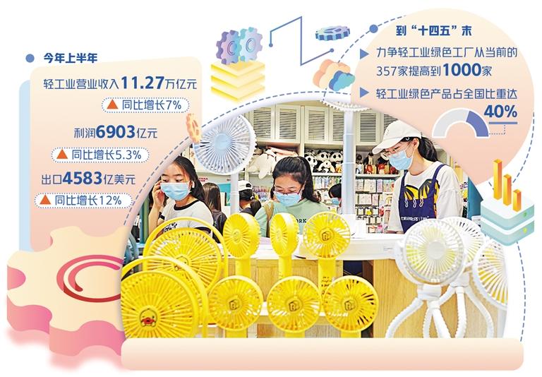 “我国轻工业努力克服新冠肺炎疫情冲击和国际形势动荡的不利影响,千方百计‘稳产稳供’,高质量发展取得初步成效。今年上半年,轻工业营业收入达11.27万亿元,同比增长7%;利润达6903亿元,同比增长5.3%;出口达4583亿美元,同比增长12%。”在日前举行的中国轻工业百强企业高质量发展高峰论坛上,中国轻工业联合会党委书记、会长张崇和表示,轻工业为稳住经济大盘作出了积极贡献。